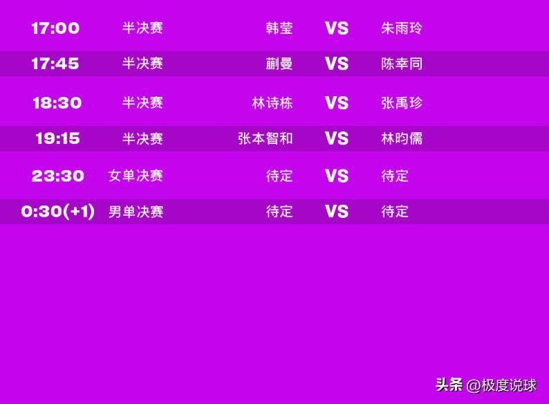 在男单冠军决出之前,还要进行两场半决赛,半决赛的对阵为林诗栋VS张禹珍,林昀儒VS张本智和,全部都是亚洲选手的对抗,欧美选手全军覆没,最有希望的小勒布与莫雷加德倒在了八强,而世界杯冠军雨果更是一轮游,最后同一天具体的比赛时间(北京时间)如下:
