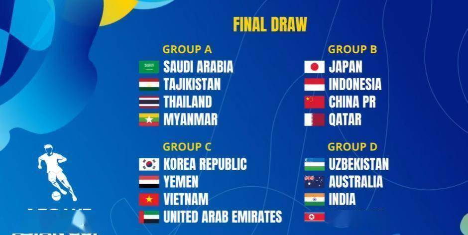 分档情况显示,第一档球队为沙特、日本、韩国和乌兹别克斯坦;第二档包括塔吉克斯坦、澳大利亚、也门和印尼;第三档有泰国、中国、越南和印度;第四档则是朝鲜、阿联酋、卡塔尔和缅甸。 中国队作为第三档球队,最终与日本(第一档)、印尼(第二档)、卡塔尔(第四档)同组。